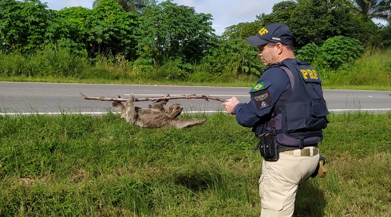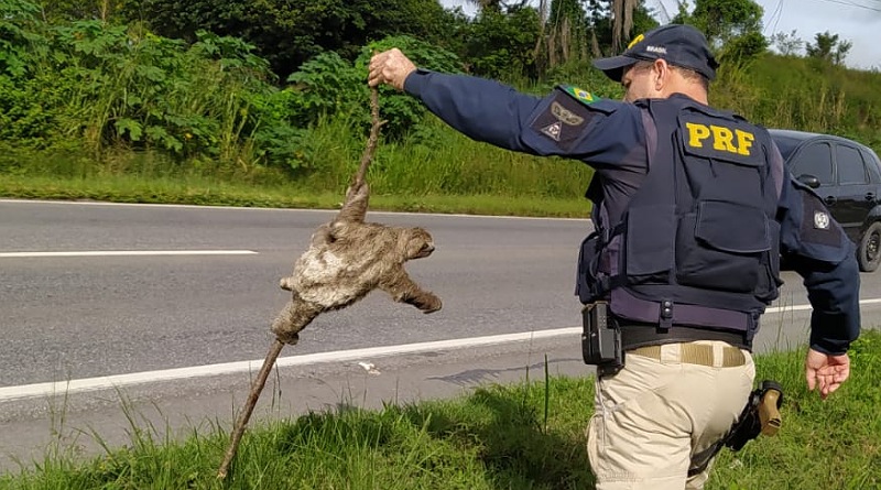 Um motorista entrou em contato com o Centro de Comando e Controle Regional da PRF e informou que havia avistado um bicho-preguiça, no acostamento do Km 73 da rodovia. Ao chegarem no local indicado, os policiais utilizaram um galho para o animal se agarrar e conseguiram retirá-lo da situação de risco.