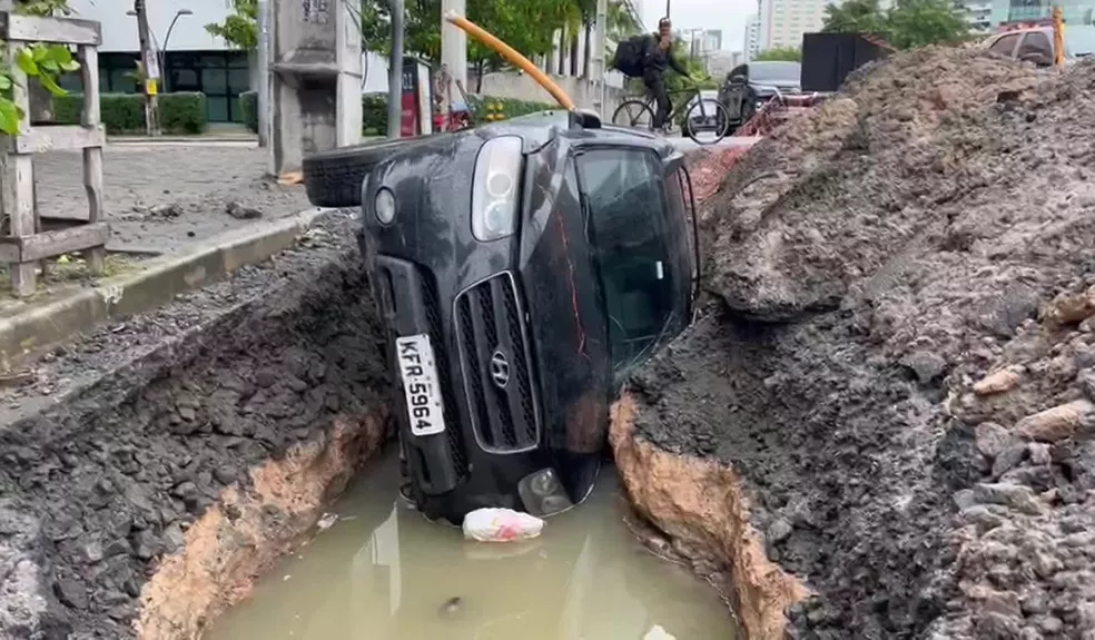 Carro cai em vala aberta para obra em Boa Viagem, na Zona Sul do Recife