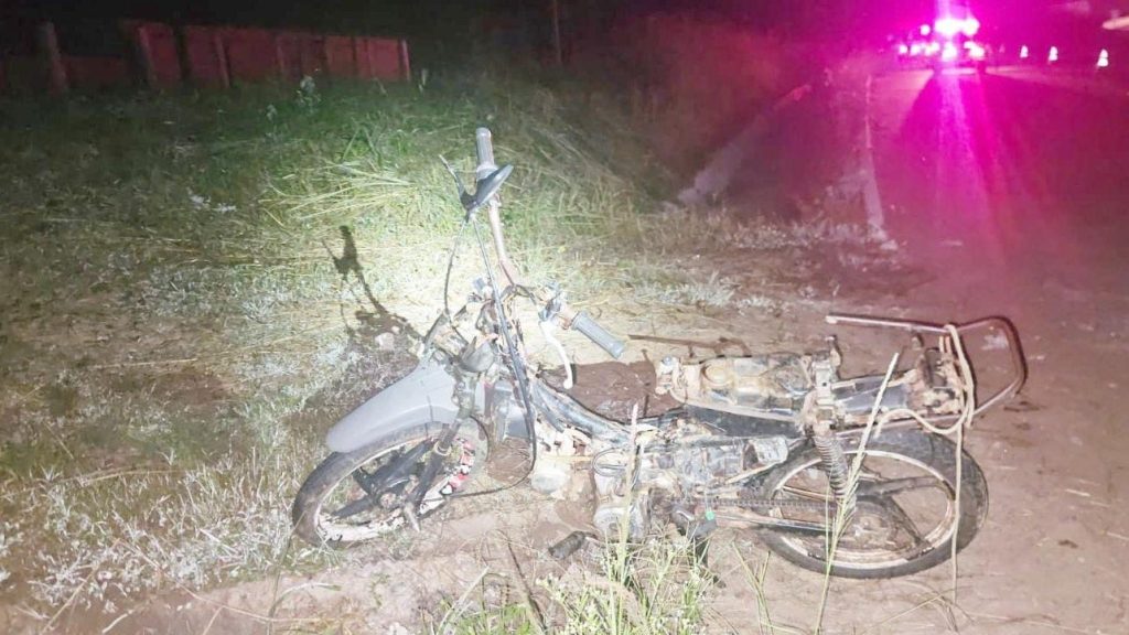 Reportagem: Um ciclomotor (cinquentinha) colidiu em uma placa de sinalização e tombou na rodovia. O passageiro (pai) faleceu no local. O condutor (filho) ficou ferido e foi encaminhado para uma unidade de saúde não identificada.