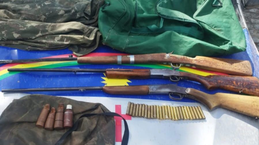 De imediato, a equipe saiu em patrulhamento na área e visualizou dois indivíduos com casacos do exército e carregando uma mochila nos braços com alguns objetos grandes nela. Estavam em uma motocicleta e quando viram o policiamento tentaram se evadir do local, mas foram capturados. Ao realizar a abordagem pessoal nos suspeitos, foi encontrado os seguintes materiais: 01 espingarda industrial Cal .36; 01 espingarda industrial/ marca Boito (carregada); 26 cartuchos de cal .36 e uma mochila com materiais de caça.