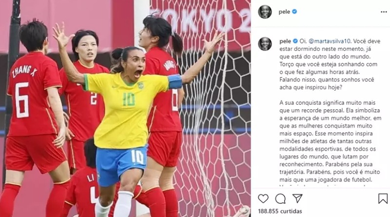 Pelé usou suas redes sociais para fazer uma homenagem para Marta, craque da seleção feminina de futebol, após a estreia com goleada de 5 a 0 nas Olimpíadas de Tóquio, na qual ela marcou duas vezes.