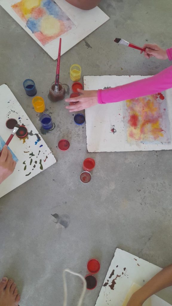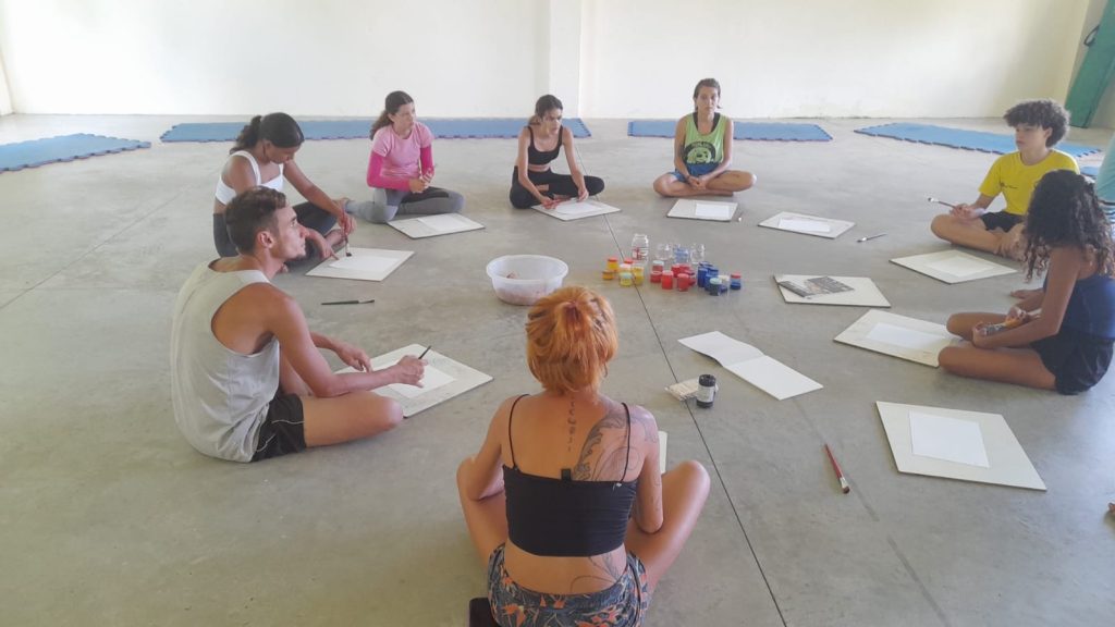 Entre uma prática e outra, a oficina se desdobrou em vivências de pintura em aquarela, onde os jovens artistas puderam registrar, em cores e formas, suas emoções, memórias e percepções. Cada pincelada foi um gesto de escuta de si, uma forma de transformar a experiência corporal em imagem, em arte.