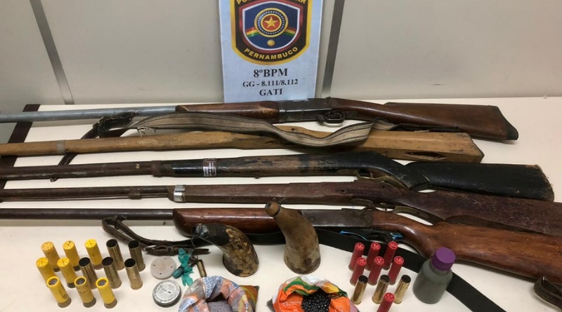 Na tarde de sexta-feira (06/08), policiais militares do 8°BPM, quando em rondas, em Serrita, foram informados por populares de que um homem possuía armas de fogo. De imediato, os militares deslocaram-se até a Rua São José, Vila Ipueiras, na Zona Rural do município, onde o suspeito foi localizado e, após confessar possuir as armas, entregou ao efetivo três espingardas antecargas e duas espingardas de cartucho, sendo uma cal. 20 e uma cal. 28, bem como treze cartuchos intactos cal. 20; dez cartuchos intactos cal. 28; 1.303g de chumbo; 158g de pólvora e 31g de espoleta com recipiente. O suspeito foi conduzido à DPC local para adoção das medidas legais cabíveis.