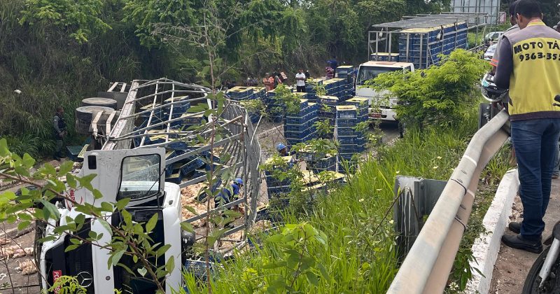 Veículo que transportava aves vivas tomba na BR 408 nesta quarta (12), em Paudalho